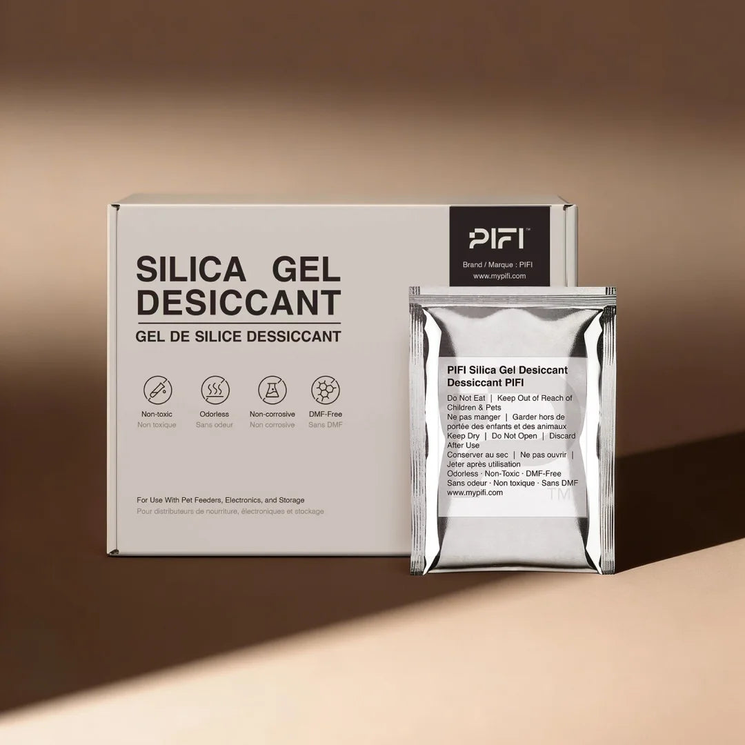 The desiccant pack Keeps your pet’s food crisp and dry all day long. It contains high-grade silica gel that effectively absorbs humidity in sealed spaces, ideal for use in feeders, storage containers, or packaging boxes.